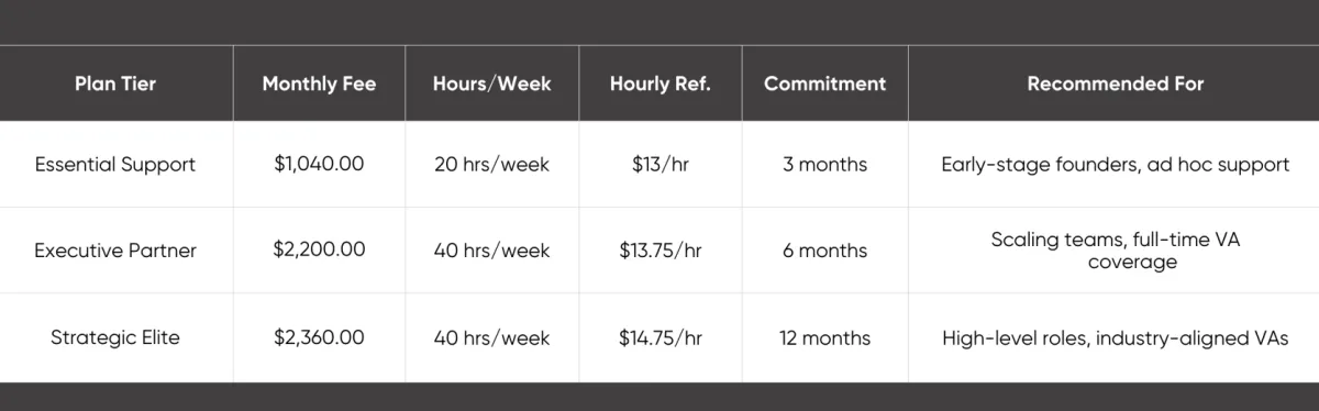 Fees cover full setup for a smooth VA start: matching, scoping, kickoff, systems setup, and workflow alignment.